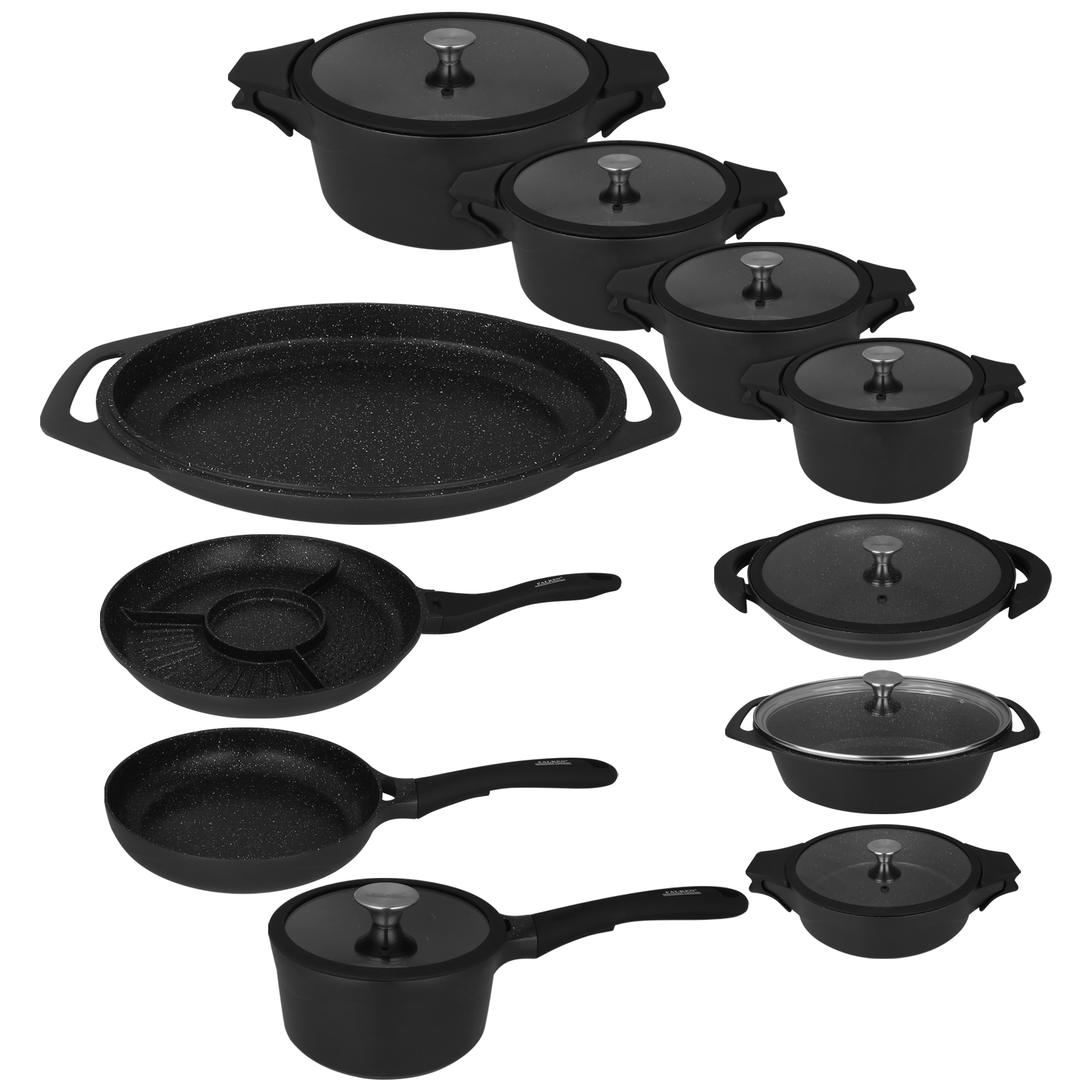 این مجموعه کامل شامل ۲۰ پارچه کاربردی از انواع قابلمه و ماهیتابهست تا برای هر نوع غذا یه گزینه مناسب در اختیارت باشه؛ از تفت دادن سبزیجات گرفته تا سرخ کردن ماهی یا پخت خورشتهای مجلسی.