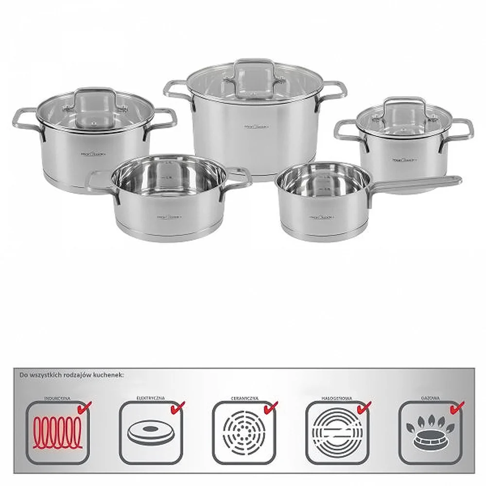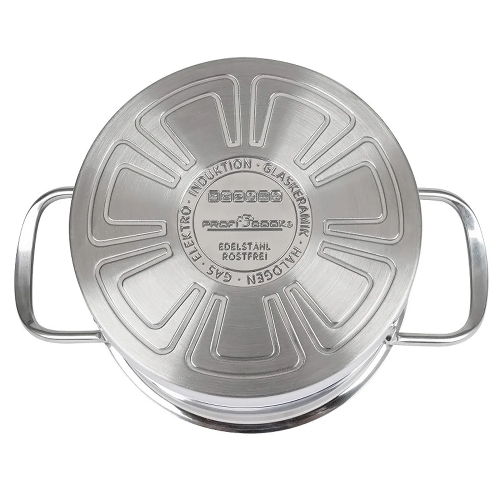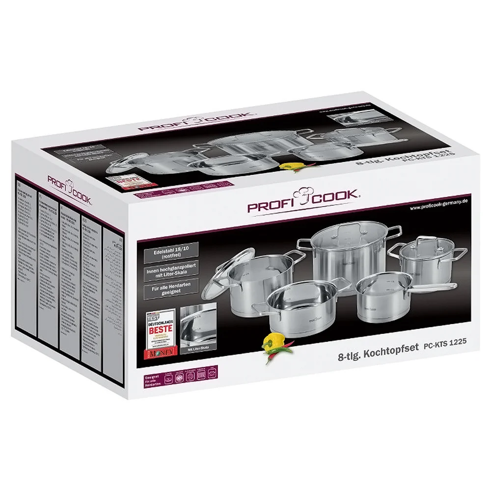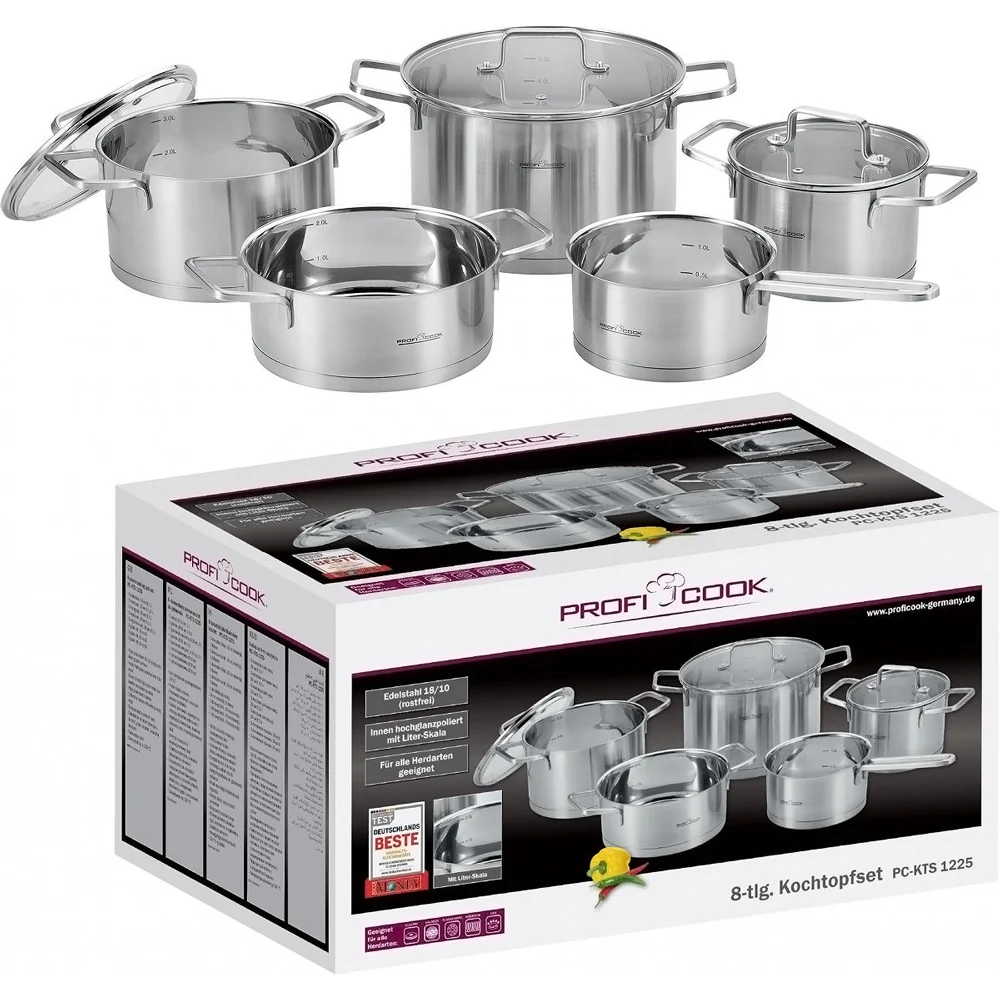 سرویس قابلمه ۸ تکه استیل ProfiCook PC-KTS-1225 با بدنه مقاوم، کف چندلایه و درب شیشه‌ای، تجربه‌ای حرفه‌ای و آسان از آشپزی روزمره برای هر آشپزخانه است.